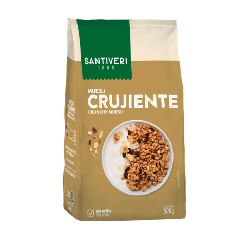 El Muesli Crujiente Santiveri puede consumirse con leche, bebida vegetal o yogur. También se puede combinar con fruta fresca, frutos secos o semillas para crear desayunos completos y equilibrados.