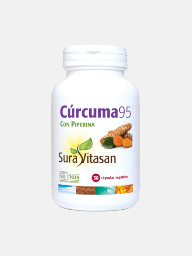 Cúrcuma 95 de Sura Vitasan es un complemento alimenticio que aporta un extracto estandarizado procedente de la Cúrcuma (Curcuma longa) con un 95% de curcuminoides garantizado.