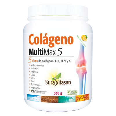 Potente mezcla de colágenos reforzada con vitaminas, minerales y nutracéuticos. Colágeno MultiMax 5 de SuraVitasan contiene 5 tipos de péptidos de colágeno bioactivos (tipos I, II, III, V y X) presentes principalmente en huesos, tendones, cartílagos y piel.