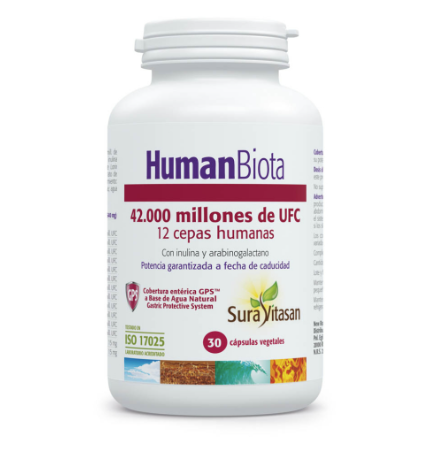 Human Biota de Sura Vitasan contiene más de 42.000 millones de UFC, con 12 cepas beneficiosas de origen humano junto con prebióticos complementarios de origen natural inulina (achicoria) y A.O.S. (alerce).