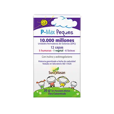 Probio Max peques de Suravitasan es una fórmula ultraconcentrada y avanzada de 12 cepas bacterianas seleccionadas, F.O.S (achicoria) y A.O.S (alerce) para ayudar al equilibrio de la flora intestinal de los más pequeños.